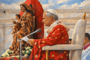 O Papa João Paulo II avançou isso na Redemptoris Mater (1987), destacando a fé de Maria como “central”, enraizada na ação prévia de Deus e capacitando sua perseverança até a Cruz — uma “riqueza de louvor” essencial hoje. Suas graças facilitaram o discipulado, dissolvendo a tensão pré-conciliar entre privilégio e imitação. Assim, a mariologia evoluiu de dogmas isolados para um arcabouço eclesio-típico, onde Maria exemplifica a pobreza, fé e união da Igreja com Cristo.